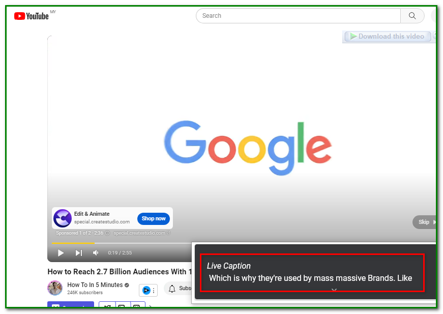 To do this, play a video and see whether the captions come on. Here we are playing a YouTube video, and the captions appear in a black box below the video.